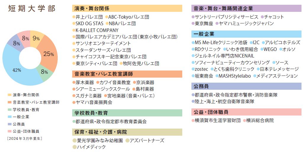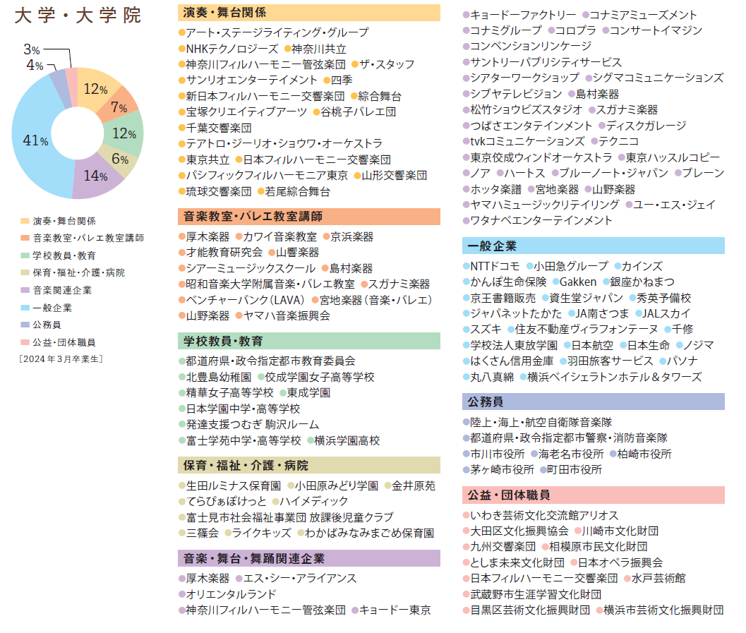 大阪フィルハーモニー交響楽団、ヤマハ音楽教育システム講師、千葉市役所、聖路加国際病院音楽療法士、千葉交響楽団、東京佼成ウインドオーケストラ、神奈川県立高等学校教員、警察音楽隊、ヤマハ音楽振興財団指導スタッフ、昭和音楽大学准教授/講師/職員/研究員、神奈川芸術文化財団、コンサートサービス、めぐろパーシモンホール 、ブシロードミュージック、マッドハウス、他大学専任教員・非常勤教員、村上市郷土資料館、ユニバーサルミュージック(韓国)