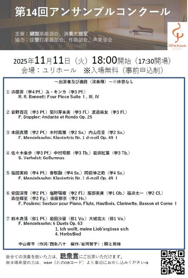 2025/11/11(火)時間:開演18:00(開場17:30)場所:昭和音楽大学 ユリホール(南校舎5階)演奏会/公演