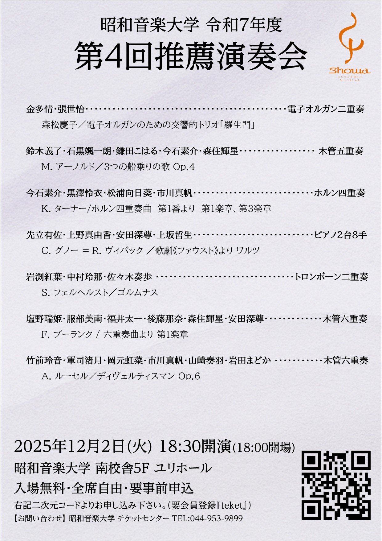 2025/12/02(火)時間:開演18:30(開場18:00)場所:昭和音楽大学 南校舎5階 ユリホール演奏会/公演