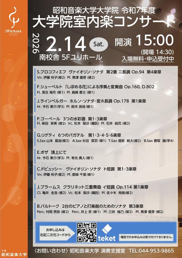 2026/02/14(土)時間:開演15:00(開場:14:30)場所:昭和音楽大学 南校舎5階 ユリホール演奏会/公演
