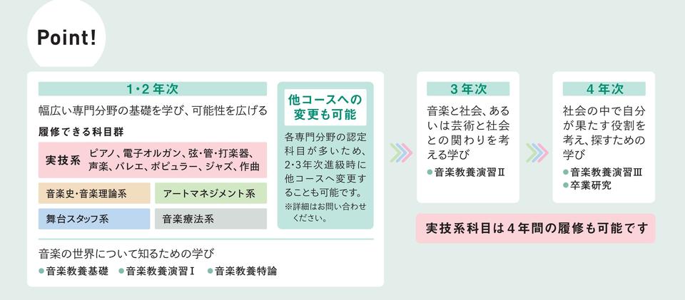 音楽を学びたい理由や動機は一人ひとり異なるものであり、それぞれが大切にしている想いがあります。そんな学生たちが、自分自身を見つめながら自分のペースで音楽と共に生きる方法を探していく場所が音楽教養コースです。音楽との多様な関わり方を実現するため、幅広い専門分野を網羅した自由度の高いカリキュラムを整えています。作曲家、作品、楽器の研究、音楽史をはじめ多岐にわたる音楽教養を身につけ、その中で関心ある分野についての専門知識を深めながら、音楽と社会をつなぐキャリアを開拓していきます。履修できる実技の種類も多く、あらゆる可能性を探ることができます。
